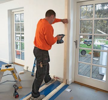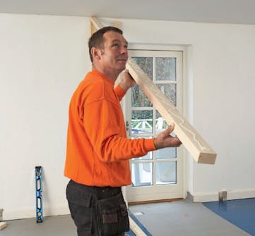 Såga till en skivbit som passar ovanför dörren. Fäst också en överliggare i öppningen så att du har något att fästa karmen i. Det är viktigt med måtten så att dörr och karm passar i öppningen.