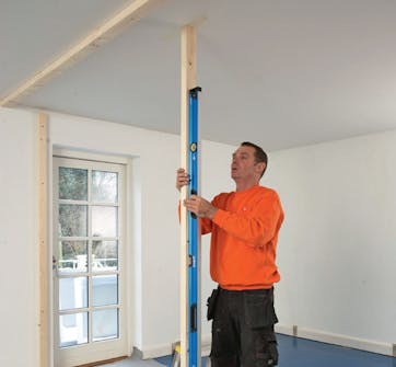 Res den regel som ska avsluta väggen på den ena sidan. När den står lodrätt vet du hur lång den andra överliggaren i taket ska vara. Gör en markering i taket, kapa regeln och sätt upp den på samma sätt som den föregående.
