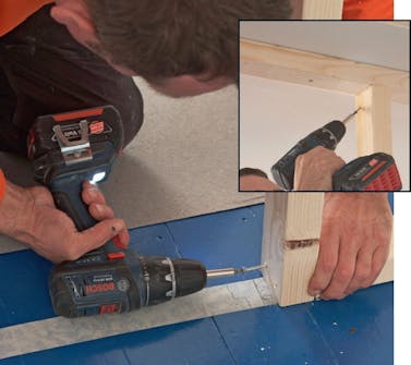 De lodräta reglarna fästs i golvregeln med 4 x 70 mm skruvar som dras i snett uppifrån. Här är det extra viktigt att vara noggrann eftersom det är ett synligt utvändigt hörn.