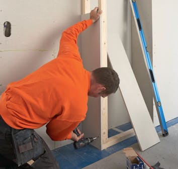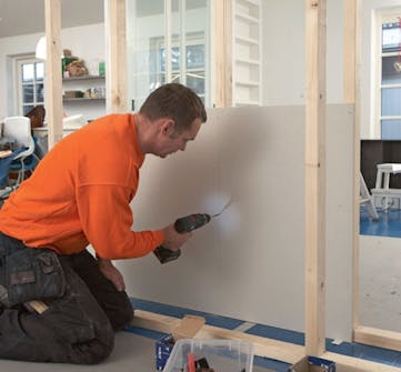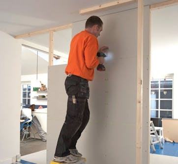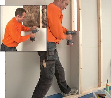 Till att börja med sätts gipsskivor endast på den ena sidan av väggen. Då blir det lättare att sätta gipsskivor på baksidan innan reglarna till den andra sidan av väggen sätts upp.