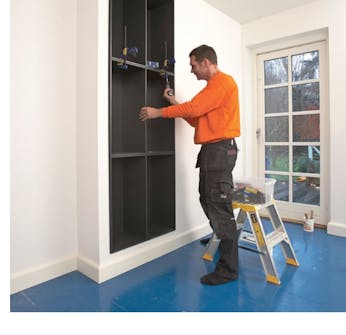 Nischen byggs upp när väggen har isolerats. Res en regel lodrätt så att nischen blir 5 mm bredare än bredden på de bokhyllor eller lådor som du vill sätta i nischen. När de är på plats fogas runt om.