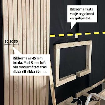 Mät och börja sätta upp ribborna. Här är ribborna 45 mm breda, men eftersom vi väljer att ha 5 mm luft mellan dem blir det så kallade modulmåttet 50 mm. Ribborna skjuts fast i reglarna med 40 mm dyckert. Se till att mäta ofta med vattenpass. Ett bra tips är att göra några 5 mm breda distansklossar som du använder överst, nederst och mitt på.