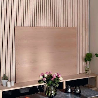 Bygg en underliggande stomme av 3-4 liggande reglar som du kan fästa tyget på och spika fast de stående ribborna i. Du kan också bygga en TV-bänk mot väggen, som här, där lösningen är en blandning av ribbor och två Ikea-skåp.