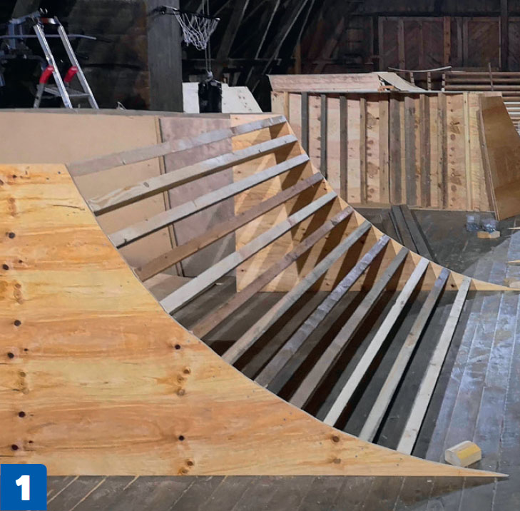 Rampen är uppbyggd i moduler som kan skruvas ihop. Vangerna till varje modul byggs av plywood. Mellan vangerna skruvas reglar fast med ca 15 cm mellanrum. Det ger ett stabilt underlag till skivorna som ska läggas ovanpå.