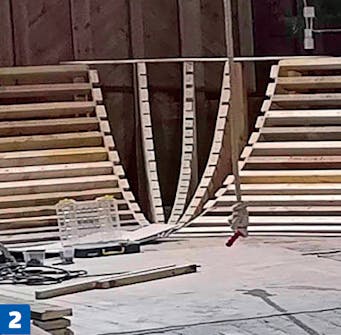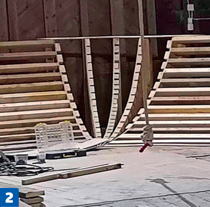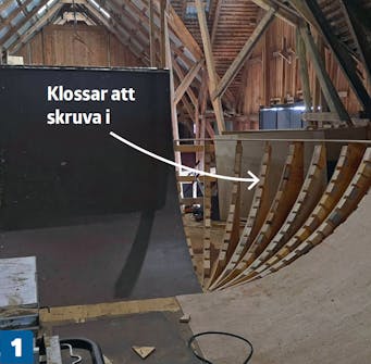För att göra en mjuk sväng placeras vangerna tätt och därefter skruvas 6 mm plywoodremsor på tvären för att förstärka det hela.