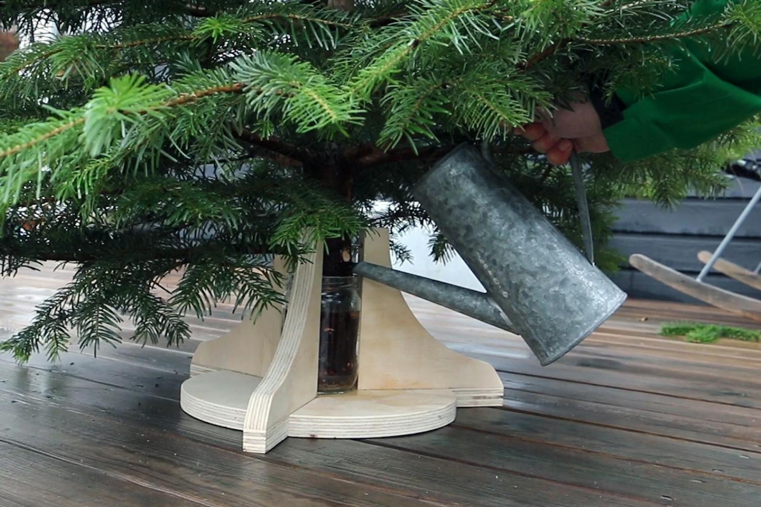 Eftersom vi vill ha möjlighet att ge granen lite vatten krävs också en behållare, till exempel en burk, som granen kan stå i. Vilken behållare du väljer beror på träets storlek. I exemplet i videon passade granens stamdiameter i storlek med en rejäl rödkålsburk.