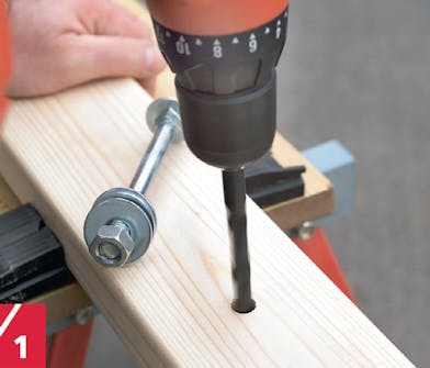 Borra ett 15 mm hål - 5 cm från övre änden på de två ryggstödslisterna (D). Borra också 15 mm hål i ändarna på påskjutsstången (G). Tryck fast rundstavar i hålen och fäst stången i hålen med lim.