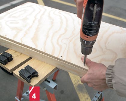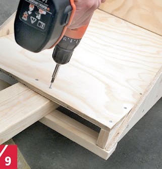 Förborra i bägge sidor av bottnen (H) med ett 5 mm borr, 1 cm från kanten och på 10 cm inbördes avstånd. Montera sedan bottenlisterna (E) med 4 x 30 mm skruvar.