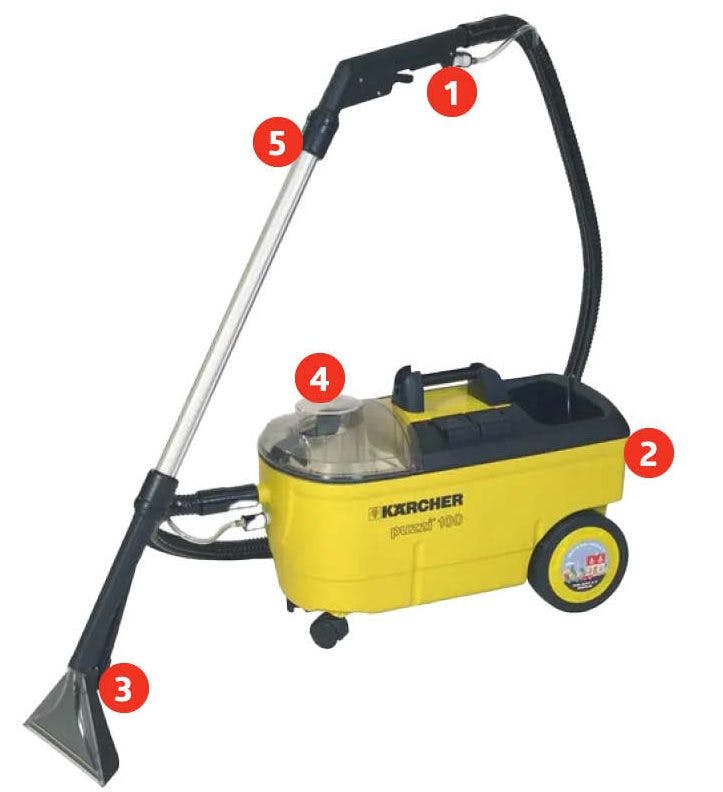 Maskinen kopplas inte till en vattenkran. Istället ska du själv tillsätta varmt vatten (max 60 grader) och rengöringsmedel. Det kan köpas när du hyr maskinen.