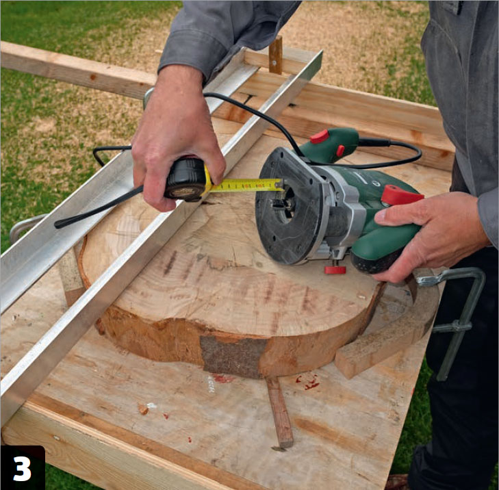 Spänn fast trästycket i en stabil bordsskiva med lite extra plats på sidorna. På två sidor av bordsskivan skruvas två 45 x 45 mm reglar fast med två raka brädor utanpå som mothåll till styrskenan.