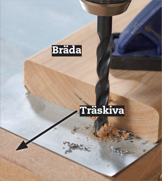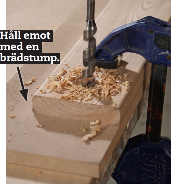 I stället för att använda en extra bräda kan du använda en traditionell - och säker - metod: nämligen att borra från båda sidorna av brädan. Både spiralborr och centrumborr har ju en liten spets som styr borren. Så snart spetsen prickar hål på baksidan stoppar du borrningen, drar upp borren och borrar igenom från baksidan genom det lilla hål som spetsen gjorde.