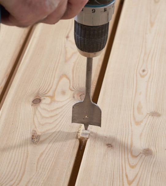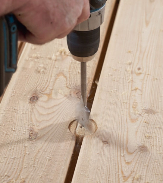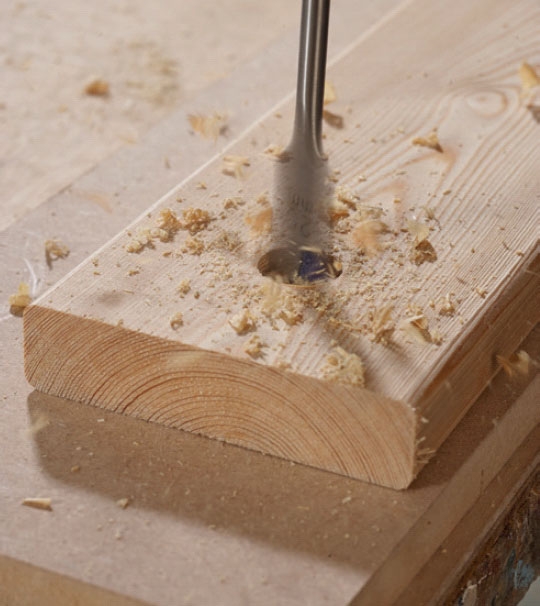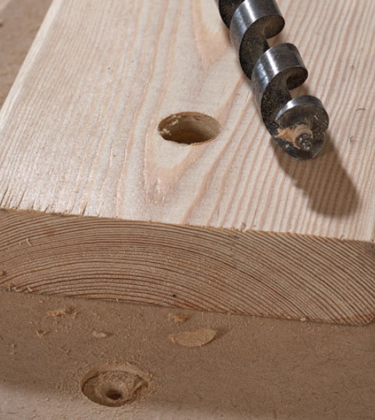 Om hålet inte ska vara så stort tar du en centrumborr eller spiralborr. Men först limmar du fast en kil mellan brädorna.