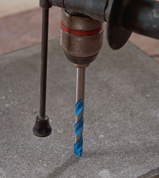 Borra med lågt varvtal med en ny och vass stenborr eller universalborr. När vattnet rinner ut är hålet klart.