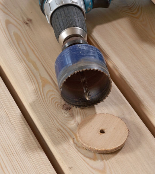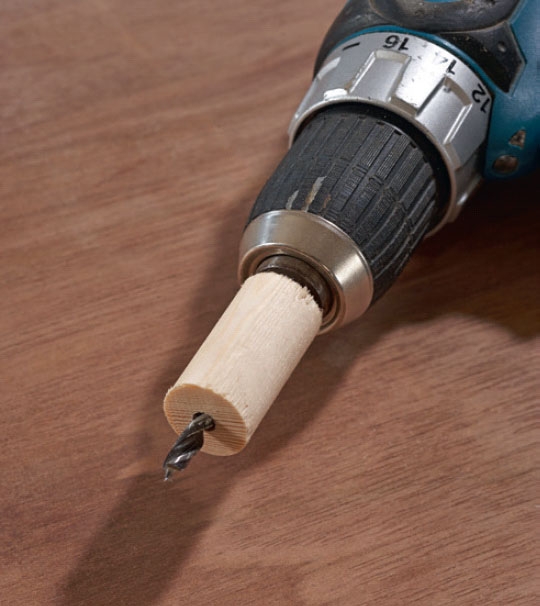 Med en hålsåg i önskad storlek borrar du loss en rund skiva av en bit restvirke, t.ex. plywood eller mdf.