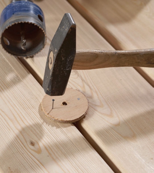 Den runda skivan fästs med ett par dyckertar så att centrumhålet hamnar mitt över mellanrummet mellan brädorna.