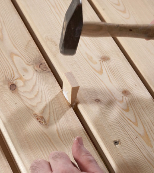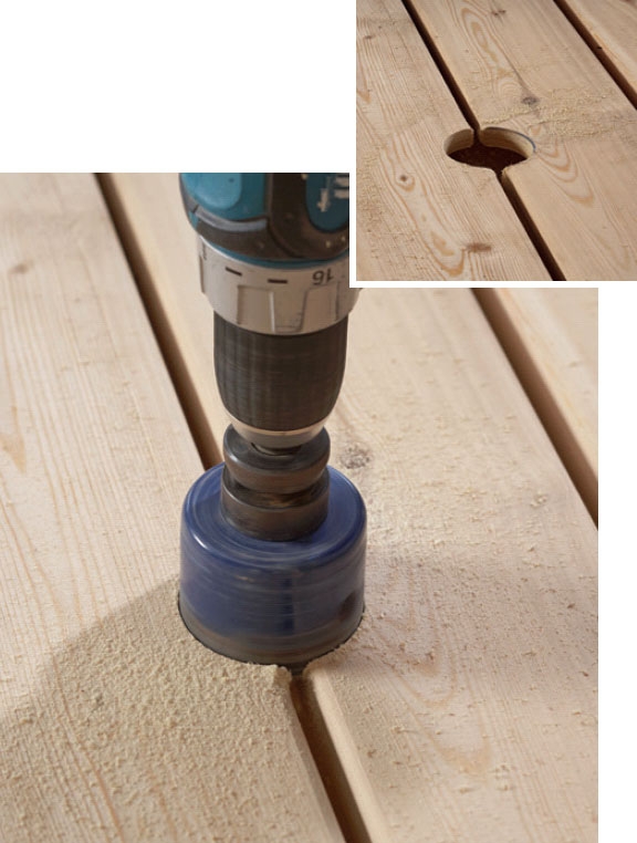 Det är vanligt att fästa brädor vid sidan av varandra med ett litet mellanrum, t.ex. på en terrass, på utebord av trä och under ett taksprång. Om du har tänkt att sätta en parasoll i träbordet eller bygga in utebelysning under taksprånget så krävs det hål.