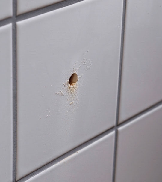 Fäst en tjock tejpbit på plattan och markera hålet. Borra nu långsamt och utan slag. Om hålet ska vara stort, 10-12 mm, borrar du först med 6 mm borr.