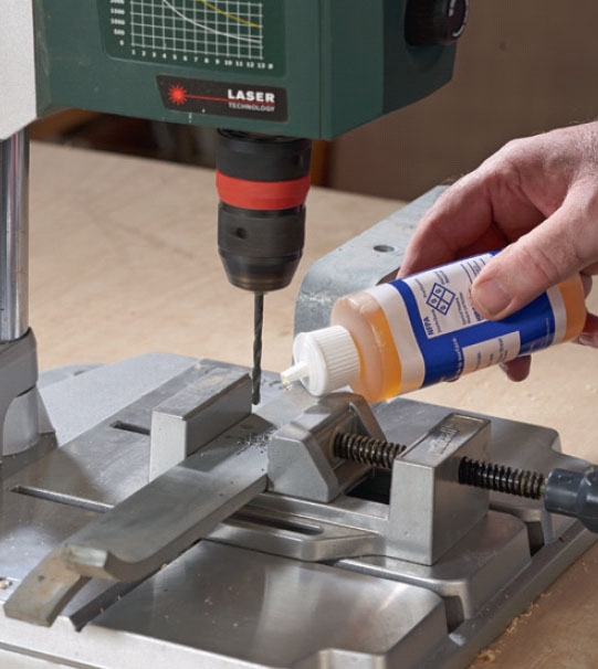 Med ett par droppar skärolja kyler du borren och arbetsstycket samtidigt som oljan bevarar borrens skär. Borra långsamt.