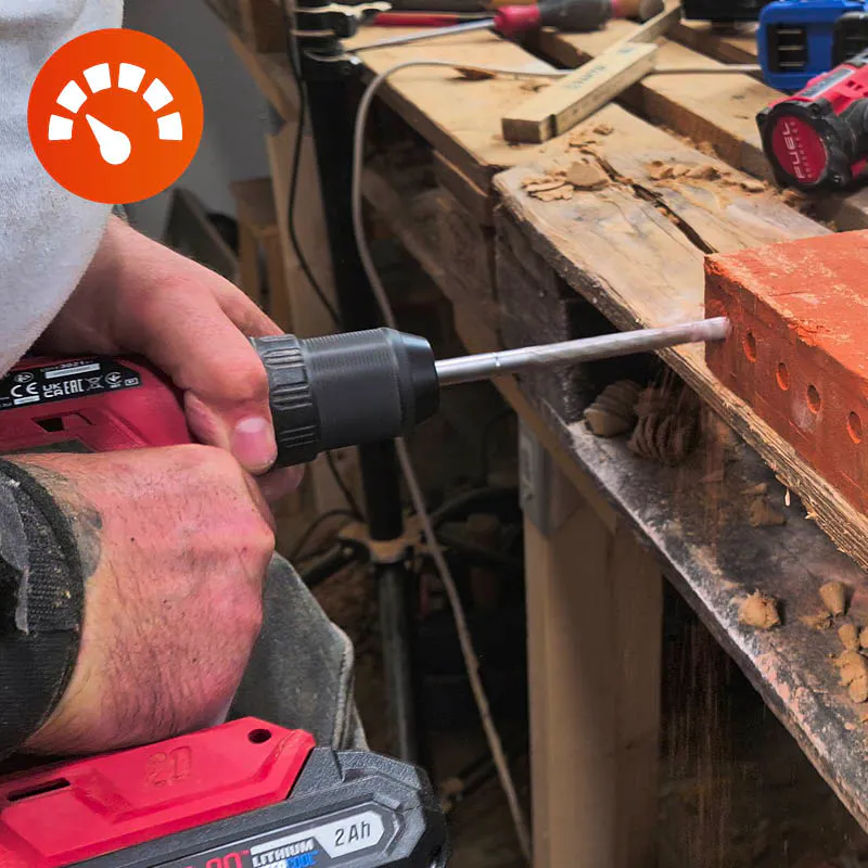 Med ett vanligt träborr är hastighets-skillnaderna inte värda att nämna. Det är dock en annan sak i tegel. Därför slår vi på slagfunktionen och borrar ett 10 cm djupt hål med ett 10 mm stenborr i en vanlig röd tegelsten medan vi tar tiden.