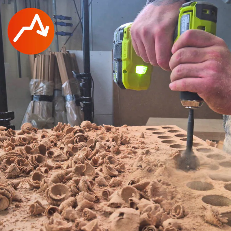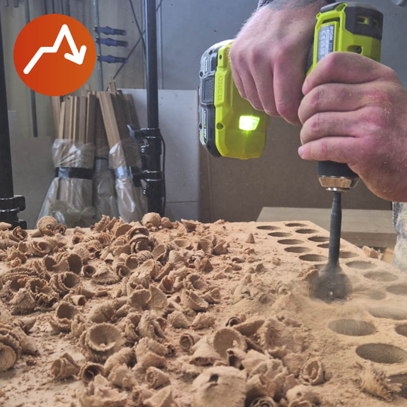 Vi pressar maskinerna till sitt yttersta när vi med ett 40 mm centrumborr borrar så många hål som möjligt i 22 mm MDF med fullladdat batteri. Flera av deltagarnas inbyggda överbelastningssäkringar slår till under tiden och kräver en paus så att maskinerna kan svalna lite innan testet fortsätter.