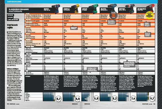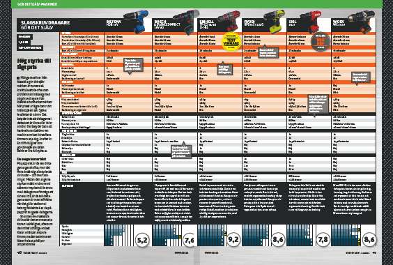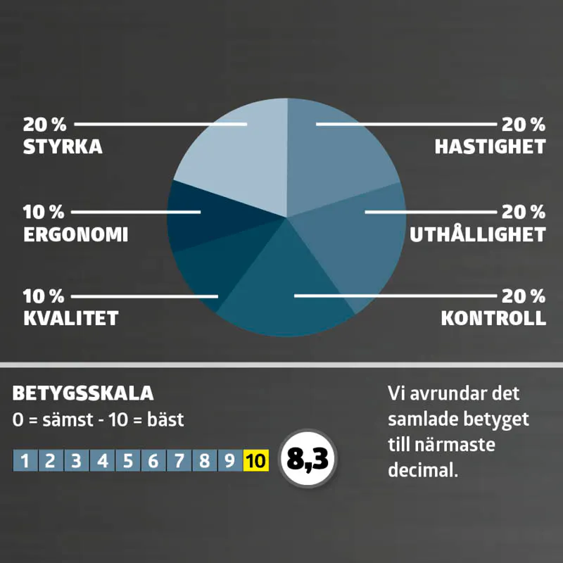 Slagskruvdragarna testas och betygsätts i de här fyra kategorierna; styrka, hastighet, uthållighet, kontroll, kvalitet och ergonomi.