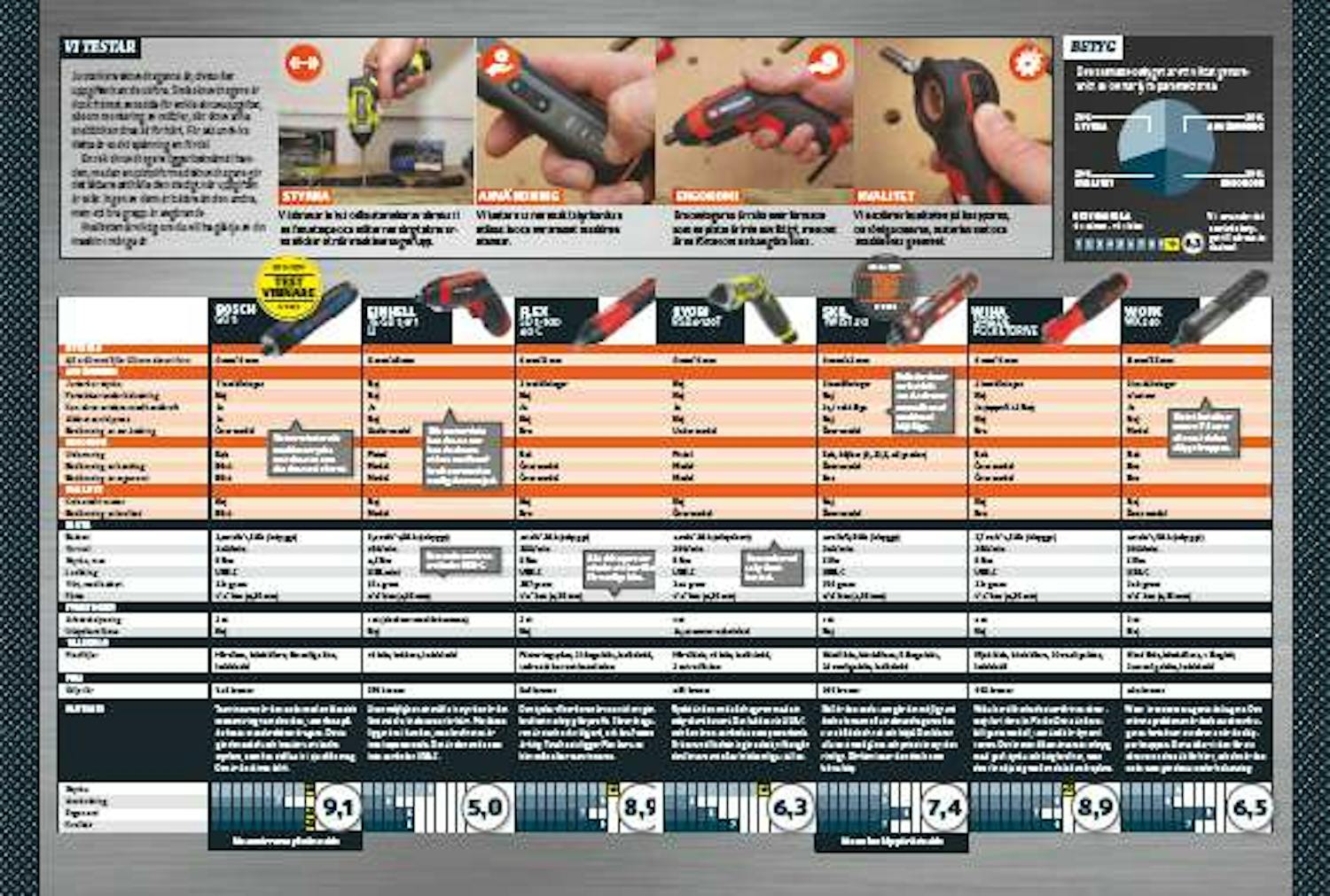 Miniskruvdragarna testas och betygsätts i de här fyra kategorierna; Styrka, användning, ergonomi och kvalitet.