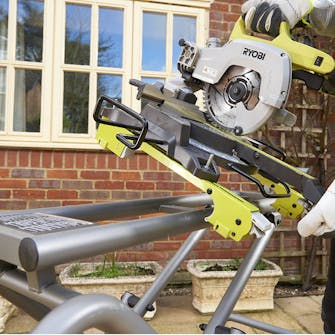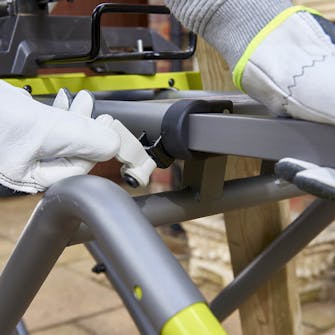 Sågbordet RLSW01 är ytterst stabilt och kan bära 180 kg. Även om det står Ryobi på sidan, så passar det till alla kap-/gersågar med hål för att sätta fast den, vilket är standard.