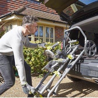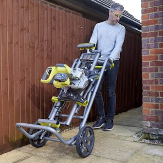 5. De store hjul på 305 mm gør det nemt at flytte bordet. Savbordet kan klappes sammen, og der er ingen grund til at afmontere saven inden.