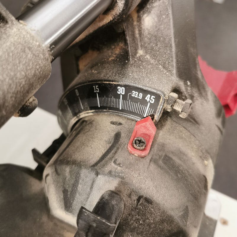 Vi lutar också klingan 45°, gör två snitt och testar vinkelsågningens noggrannhet.