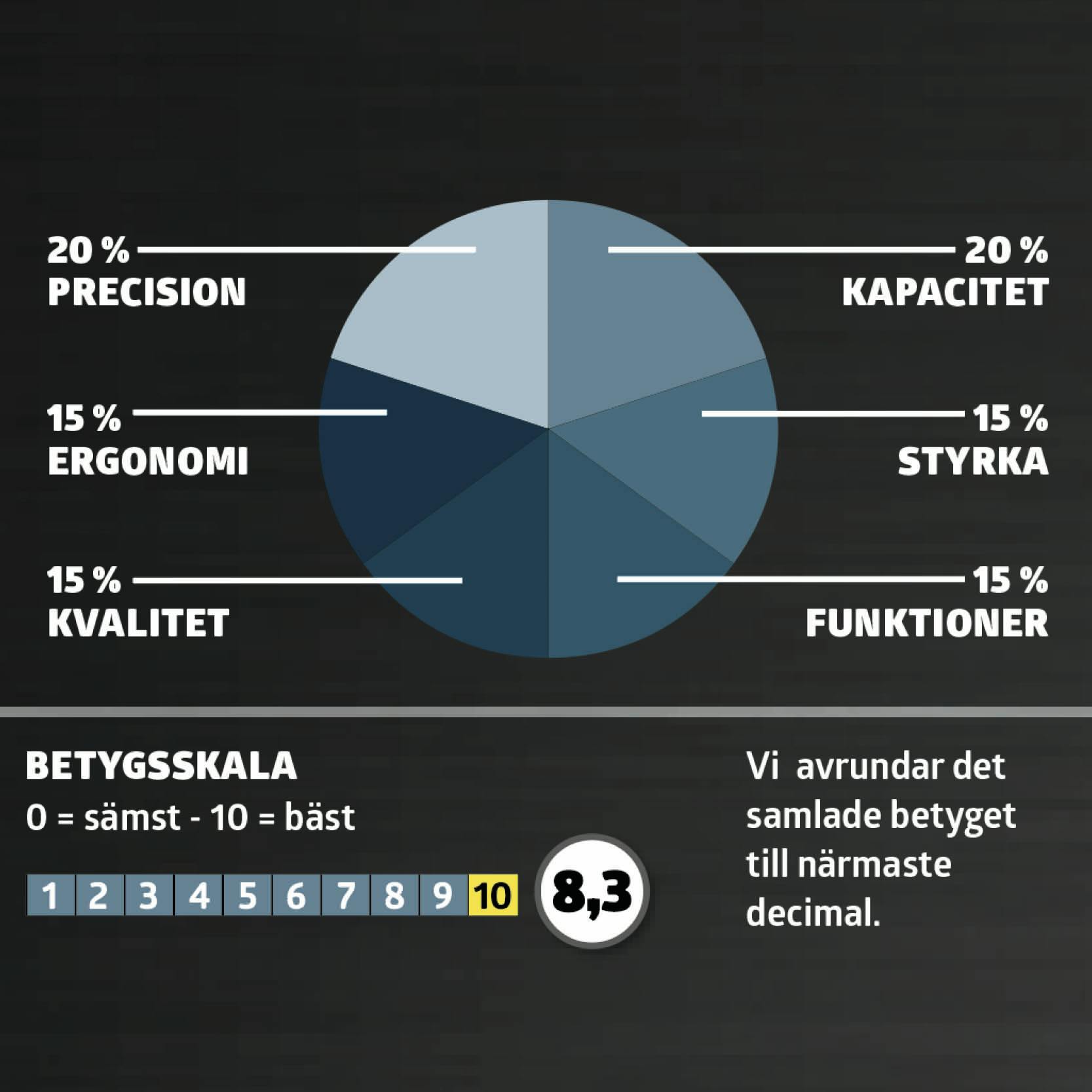 Sågarna testas och betygsätts i de här sex kategorierna; precision, kapacitet, styrka, funktioner, kvalitet och ergonomi.