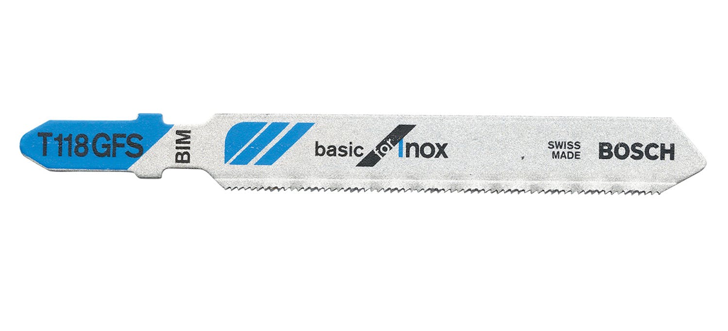 Standardbladet för metall sågar lätt plåt på upp till 1,5 mm tjocklek. Vi pressade bladet ordentligt genom att såga i 4 mm järn, vilket gick bra. Till kurvor krävs ett smalare sågblad.