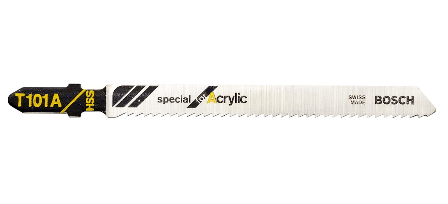 Specialbladet ger snygga sågspår i akryl och andra plaster. Det är viktigt att sänka farten i tjocka skivor och föra sågen långsamt framåt. Annars blir spåret ojämnt som på bilden.