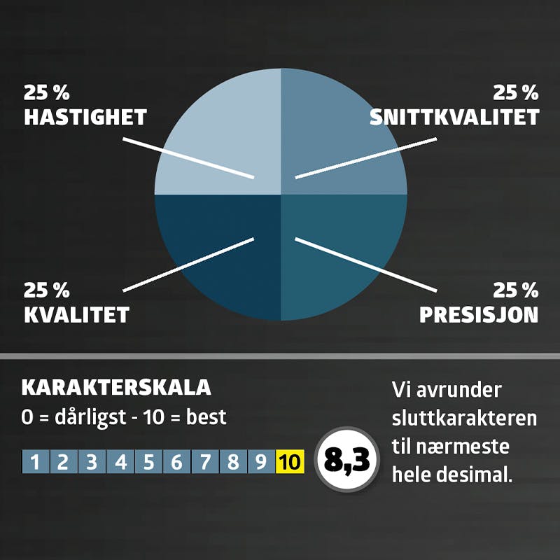 Sticksågarna testas och betygsätts i de här fyra kategorierna; hastighet, snitt, precision och kvalitet.