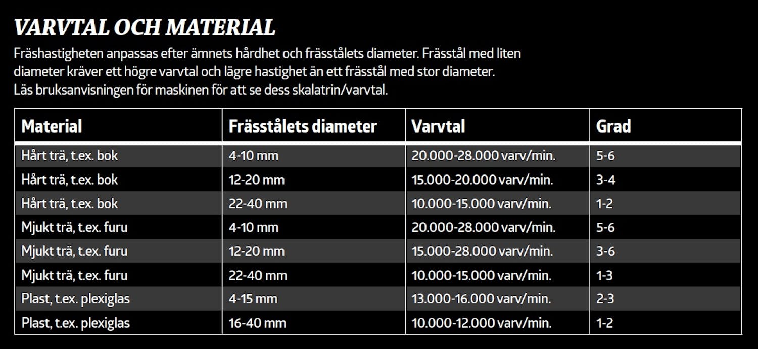 VARIABEL HASTIGHET är optimalt. Ger möjlighet att välja varvtal som passar både frässtål och material. Finns inte på alla maskiner.