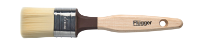 Välj gärna en oval pensel. Den har de bästa egenskaperna från runda penslar, som används till kantmålning, och från platta penslar, som används till stora ytor. Med en oval pensel är det ganska lätt att måla en rak, skarp linje eller kant, t.ex. längs foderlister, mot paneler och längs socklar. Men då ska du vinkla penseln en aning och vrida den så att du mest målar med den smala sidan. Om du håller penseln rakt får du ett mycket slätt penseldrag utan synliga spår längs sidorna från penselns kanter. Sådana spå bildas annars lätt när du använder en platt pensel med hårda, villiga syntetiska penselhår.