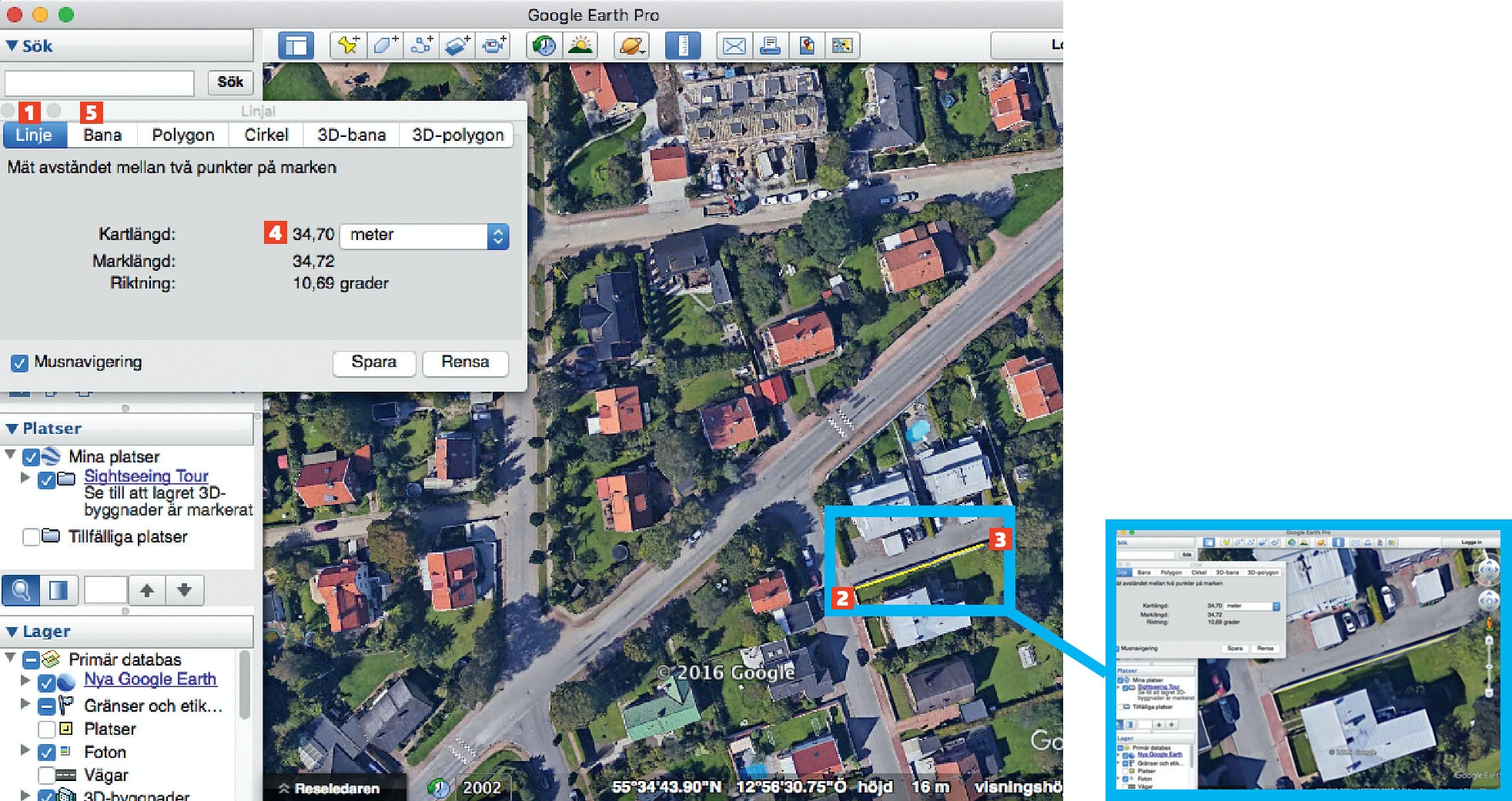 För att välja den vanliga linjalen, så att du kan mäta upp längder, t.ex. från väggen till tomtgränsen eller längden på ditt plank, ska du klicka på fliken Linje 1. Klicka sedan där mätningen ska börja 2 och klicka igen där du vill att den ska sluta 3. Här kan du se att planket är strax under 35 meter långt 4. Vill du göra mer avancerade mätningar, t.ex. runt hörn, ska du istället använda verktyget under fliken Bana 5.