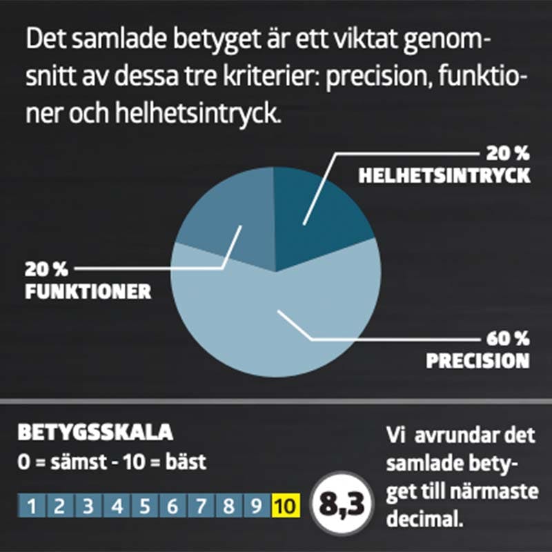 Det samlade betyget är ett viktat genomsnitt av dessa tre kriterier: precision, funktioner och helhetsintryck.