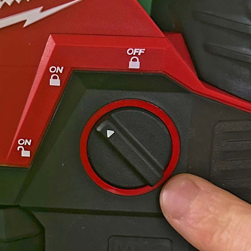 Maskinen är fäst på en magnetisk konsol där du kan rikta in de lodräta markeringarna med en liten finjusteringsskruv. Ovanför och under lasern möts de två lodräta markeringarna i ett kryss. När du justerar de lodräta markeringarna med finjusteringsskruven hamnar de två kryssen på exakt samma ställe. Detta gör det mycket enkelt att få Milwaukee att stå precis som du vill.