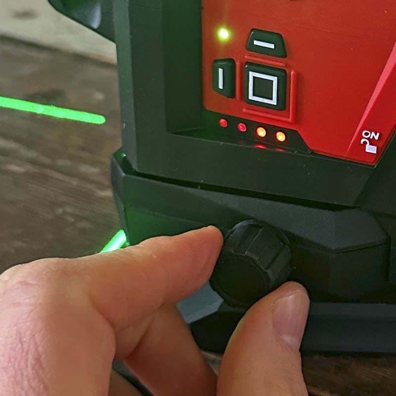 Räckvidden är imponerande för att vara en röd laser och slår flera gröna lasrar i det specifika testet. Ganska överraskande överträffar den röda Makitan även sin gröna motsvarighet när det gäller synlighet. Du får lasermärkning med pulsfunktion, vilket innebär att du kan förlänga räckvidden med en digital mottagare. Du kan ställa in ljusstyrkan i tre nivåer, och tiden för självnivellering är den snabbaste i testet tillsammans med Bosch och den andra Makitan.