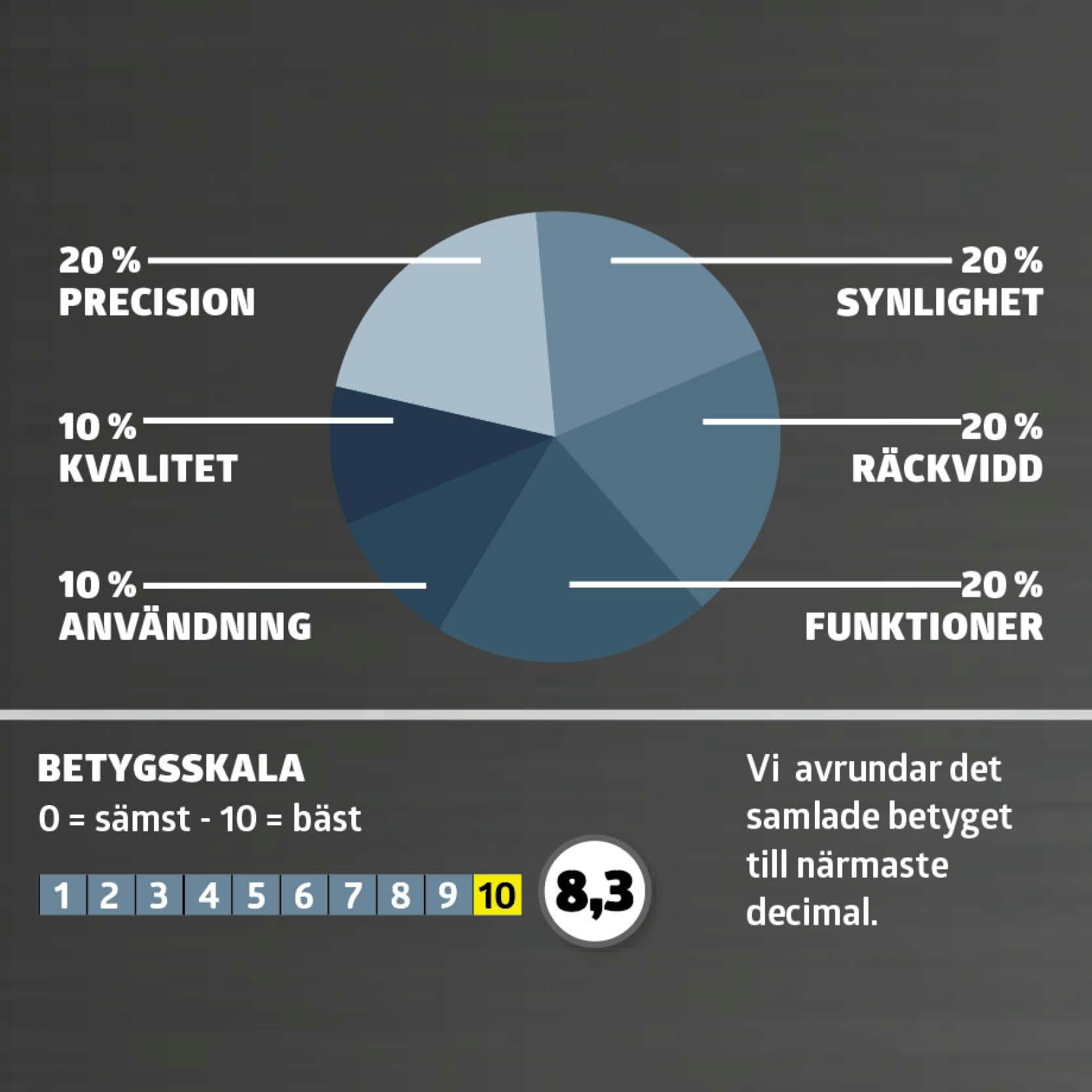 3x360°-lasrarna testas och betygsätts i de här sex kategorierna; precision, synlighet, räckvidd, funktioner, användning och kvalitet.