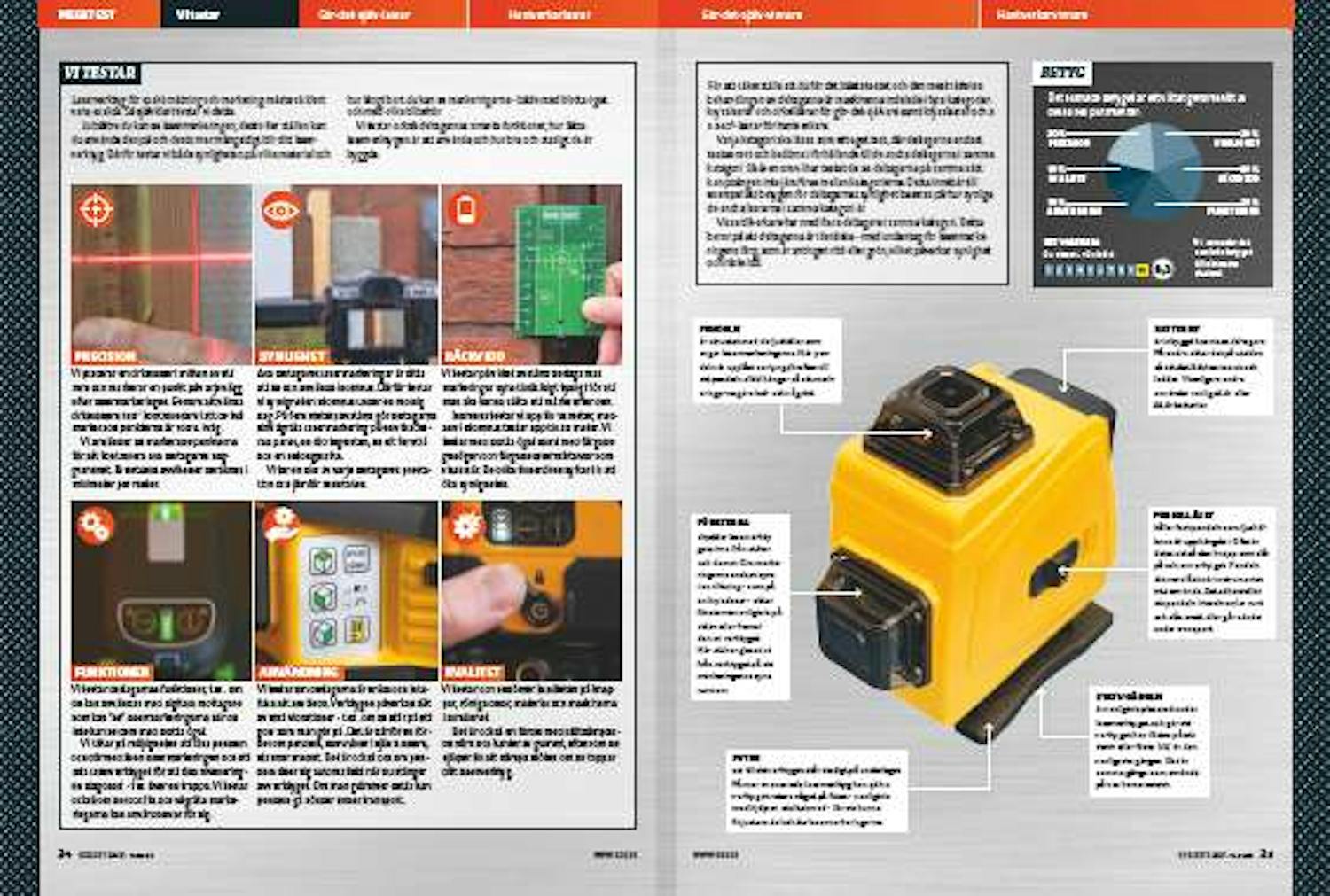 Vi testar om deltagarna är enkla och intuitiva att använda. Verktygen påverkas lätt av små vibrationer - t.ex. om de står på ett golv som man går på. Det är därför en fördel om pendeln, som håller i själva lasern, stannar snabbt. Det är också bra om pendeln låser sig automatiskt när du stänger av verktyget. Om man glömmer detta kan pendeln gå sönder under transport.