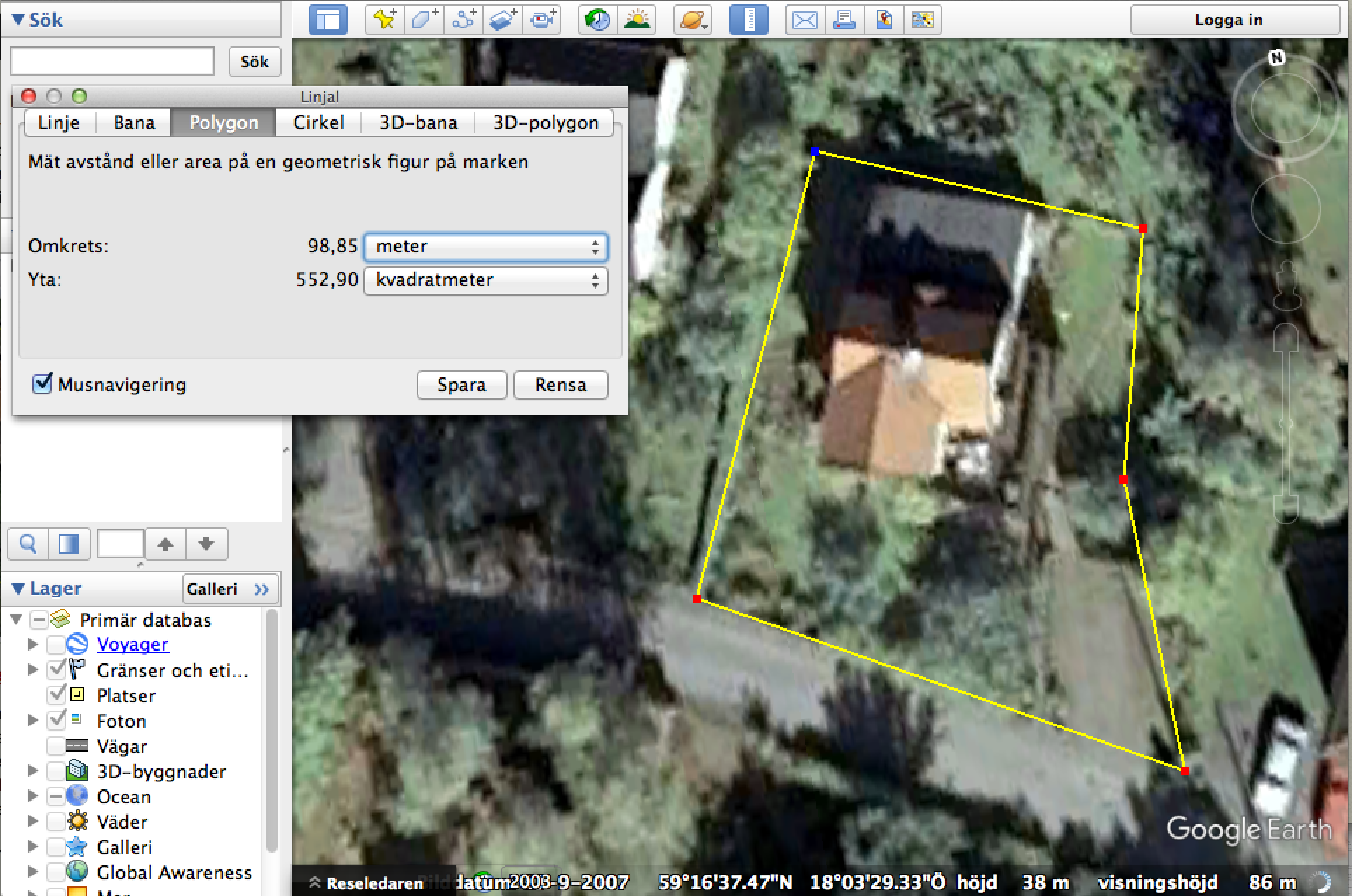 Välj Polygon-verktyget och klicka med musen på kartan där du vill göra en uppmätning. Det kan vara lite besvärligt och trilskas i början, men du kan alltid klicka på Rensa och börja om från början.