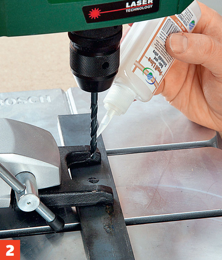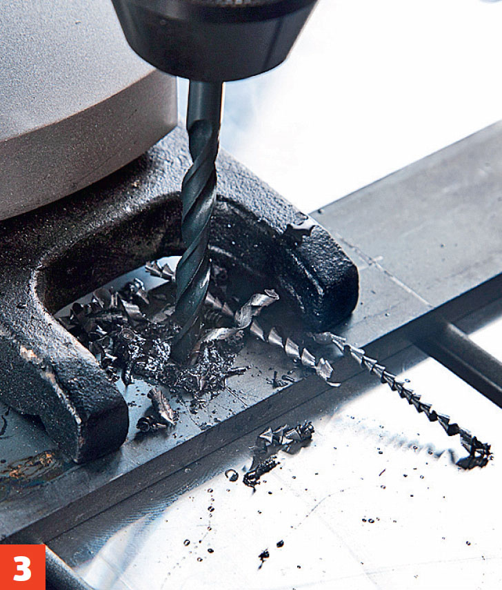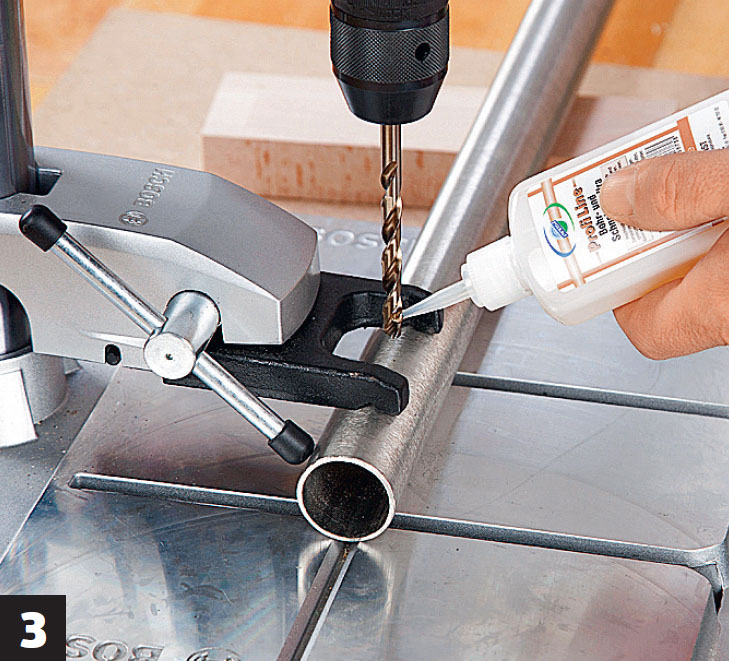 Borra genom metallen. Pausa efterhand, då du droppar på skärolja. Långa metallspiraler betyder att borret är vasst.