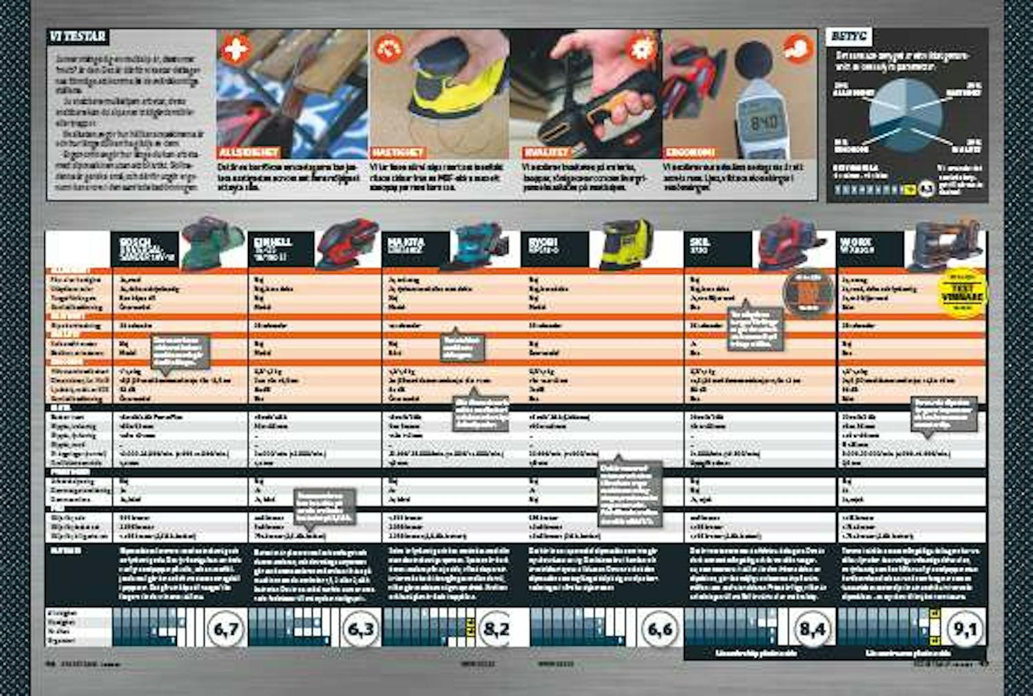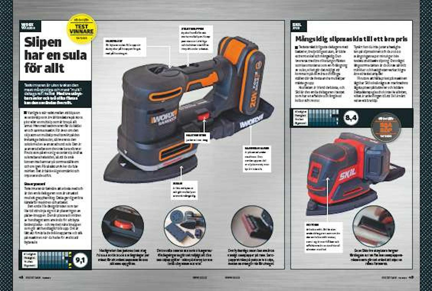 Vanligtvis står valet mellan att köpa en excenterslip som är världsmästare på stora ytor eller en multislip som är bra på allt annat. Men med testvinnaren får du båda i en och samma maskin. För även om den säljs som en multislip med tonvikt på den trekantiga deltasulan, så levereras den också med en avancerad rund sula. Den är avancerad eftersom den inte bara vibrerar. Precis som på en vanlig excenterslip ändras sulans bana hela tiden, så att de små kornen inte hamnar på samma ställe om och om igen. På så sätt undviker du fula märken. Det är både väl genomtänkt och imponerande utfört.