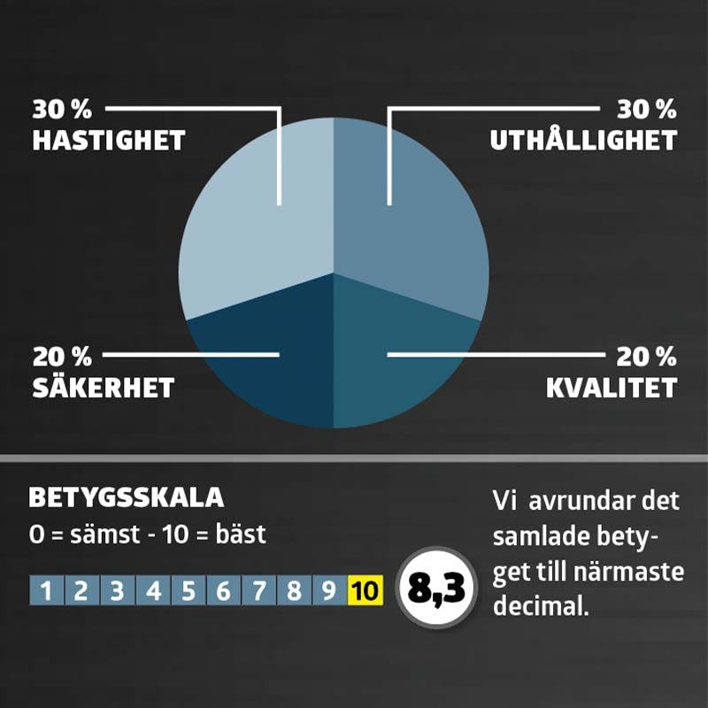 Vinkelsliparna testas och betygsätts i de här fyra kategorierna; hastighet, uthållighet, kvalitet och säkerhet.