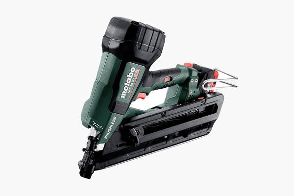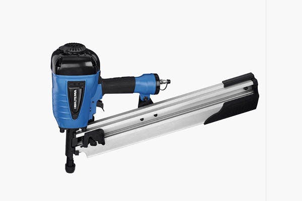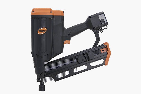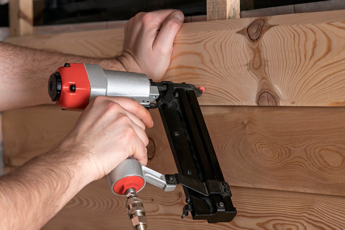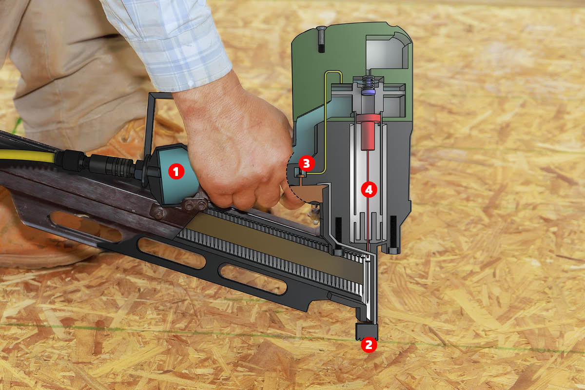 Pistolen kopplas till en kompressor och använder den komprimerade luften för att skjuta iväg spiken.