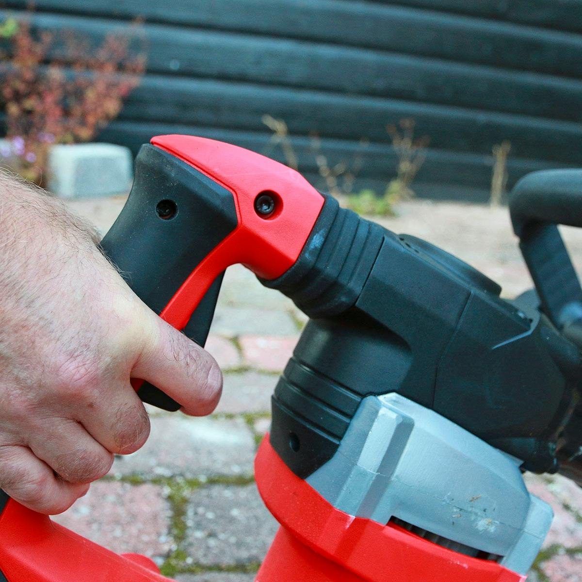 Du får inte heller vita fingrar när du har använt Einhell. Den har en bra länkning från handtaget med av- och på-knappen till motordelen. Du förlorar inte på något sätt känslan för maskinen, men det dämpar ändå de kraftigaste stötarna från maskinen.