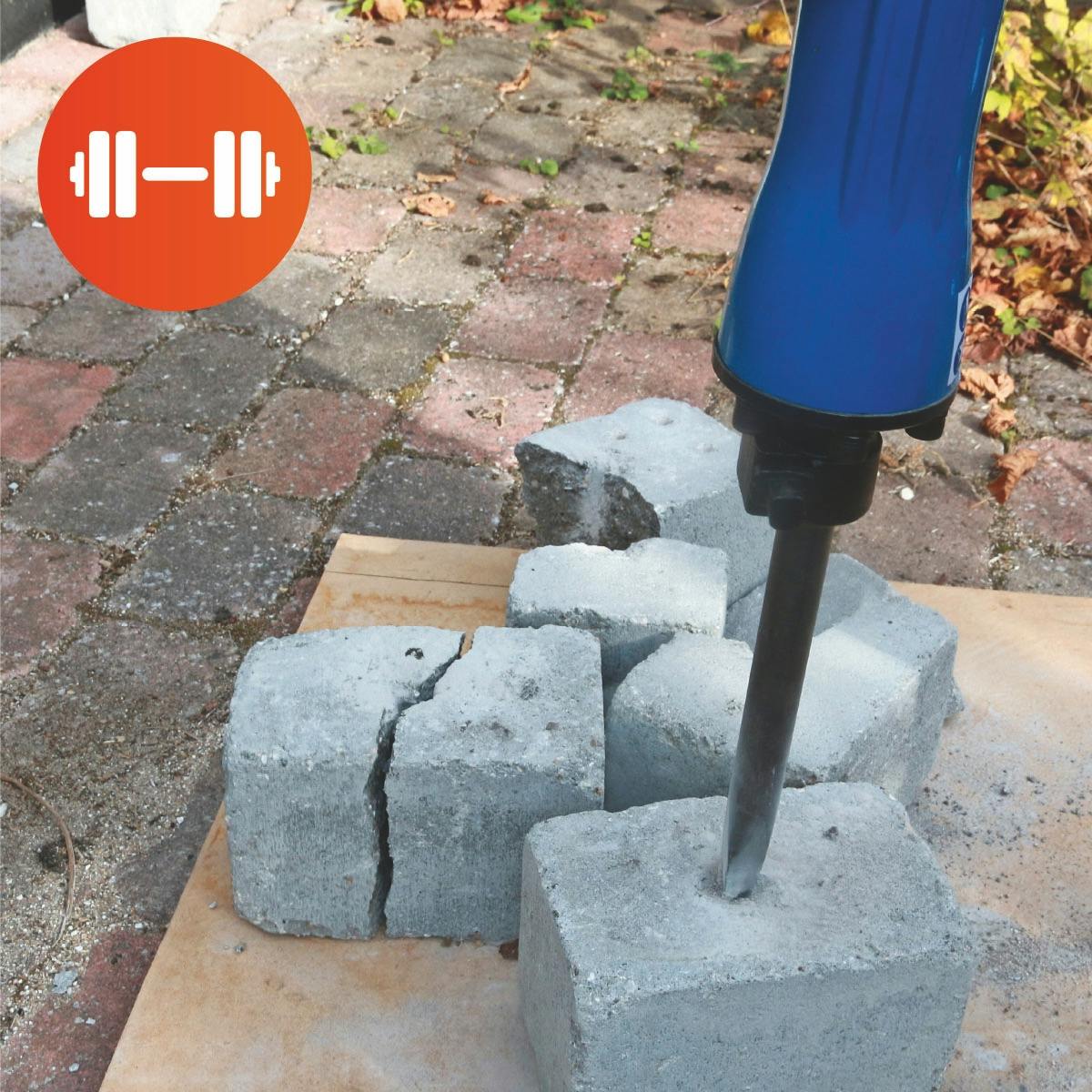 Maskinen från Einhell är bara två sekunder långsammare än vinnaren i vårt styrketest. Den har “bara” 32 joule i slagenergi, men kan verkligen omsätta den kraften ut i mejseln via sin pneumatiska hammarmekanism med massor av energi bakom varje slag. För allroundanvändning och särskilt vågrätt är den minst ett par klasser bättre än de andra. Förklaringen är att den är kompakt och lättare att hantera än de flesta hammare i samma prisklass. Så snart man behöver bila en längre tid – och särskilt om det är vågrätt – gör den stor skillnad jämfört med tyngre konkurrenter.
