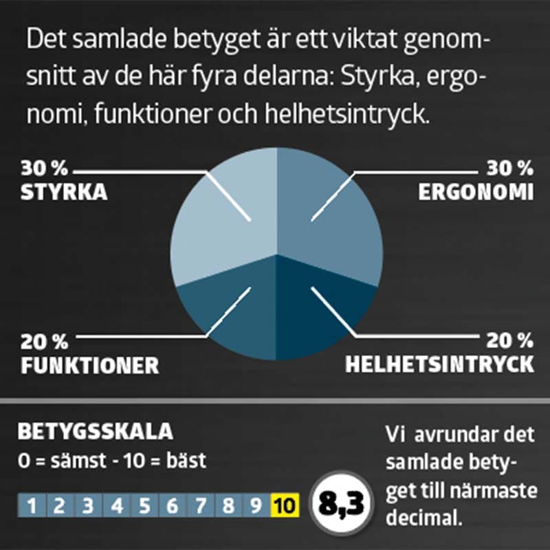Det samlade betyget är ett viktat genomsnitt av de här fyra delarna: Styrka, ergonomi, funktioner och helhetsintryck.