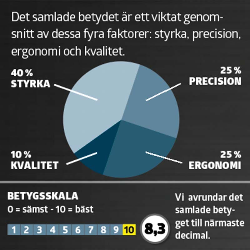Det samlade betydet är ett viktat genomsnitt av dessa fyra faktorer: styrka, precision, ergonomi och kvalitet.